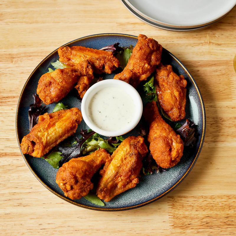Frank's or BBQ sauce. Ranch or blue cheese.