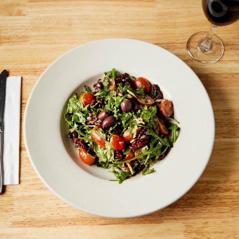 Arugula, cherry tomatoes, shaved parmesan, and candied walnuts.