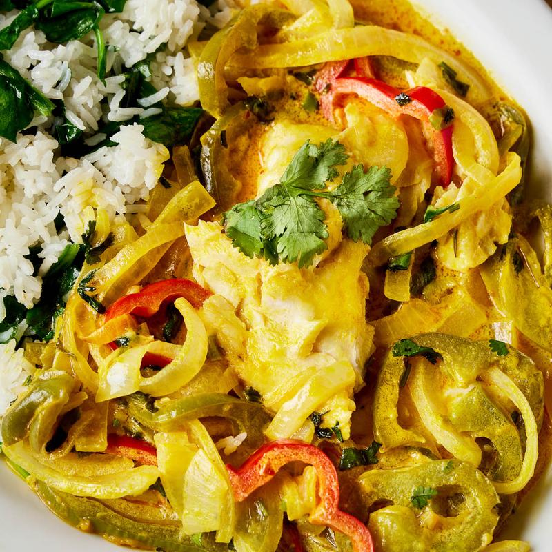 Simmered fish of the day with bell peppers, onions, cilantro, and coconut milk in a light tomato sauce. Topped with slices of hard-boiled eggs. Served with spinach and rice.