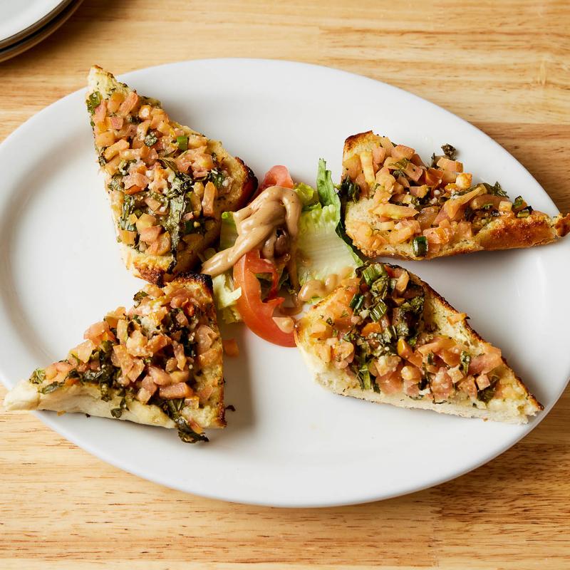 Half Tray $40.00 | Full Tray $80.00 • Baked bread, olive oil, tomatoes, cut garlic, green onions, basil & parmesan.